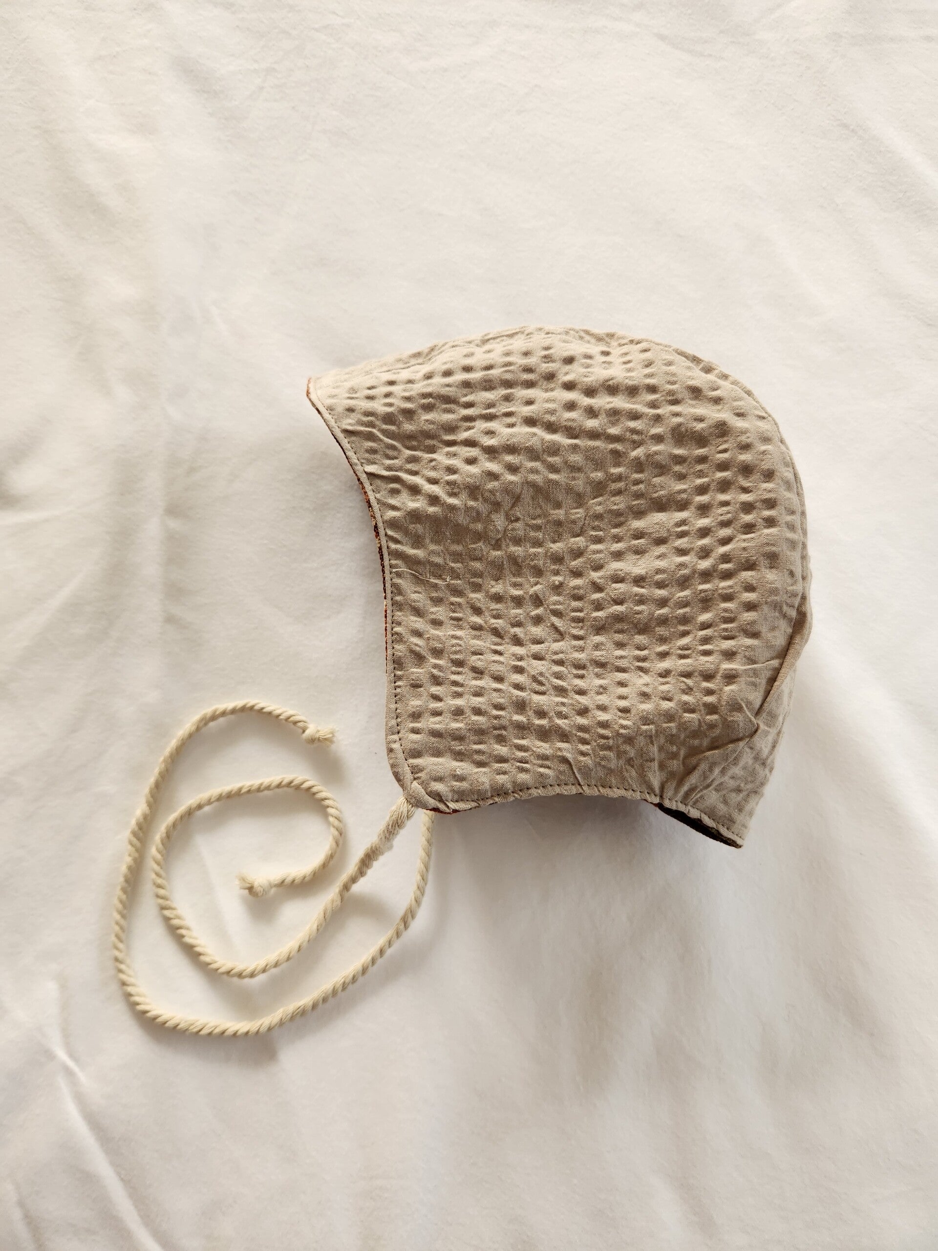 This Little Bean bonnet is lovingly crafted from beautiful vintage ‘Liberty’ linen in rich autumnal tones, where warm rust, olive and soft golden hues weave together in timeless charm. Lined with gentle Sea Fog cotton seersucker, it is finished with soft cotton ties for a comfortable, secure fit. Perfect for your little one’s autumn-winter wardrobe. This reversible bonnet is carefully handmade, with slight variations in print placement and stitching — a small reminder that each piece is sustainably made and truly one of a kind. Please use under adult supervision. 🍂🤎